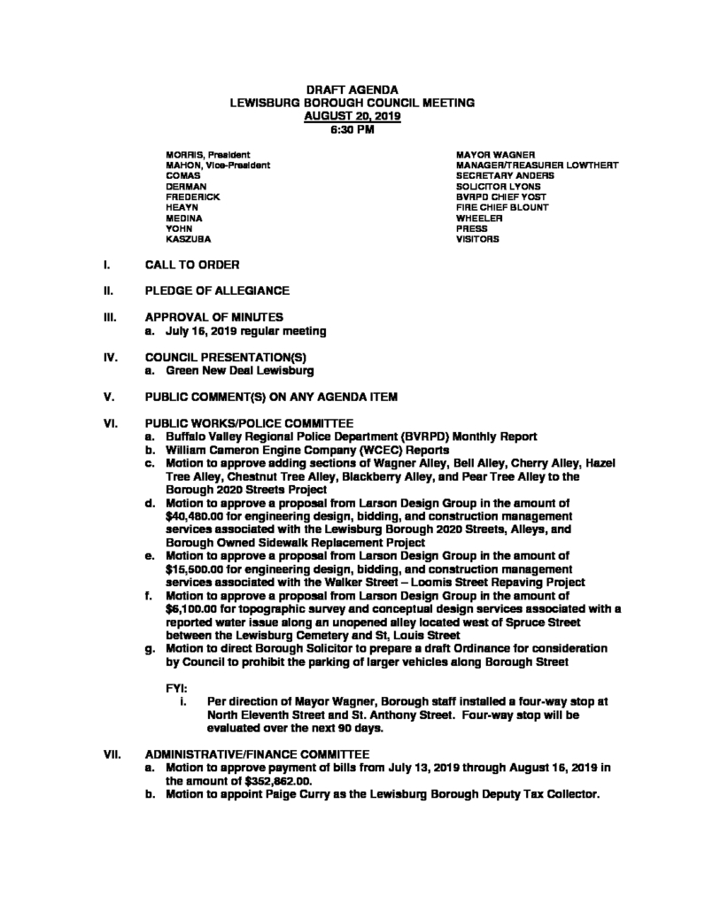 Warning: Undefined array key "file" in /home/lewisburgborough/public_html/wp-includes/media.php on line 1774 08-20-19 Draft AgendaAugust 20, 2019 https://www.lewisburgborough.org/wp-content/uploads/LewisburgBoroughLogo-Darker_web.png 0 0 Kathy Wendt https://www.lewisburgborough.org/wp-content/uploads/LewisburgBoroughLogo-Darker_web.png Kathy Wendt2019-08-20 10:58:062019-08-20 10:59:3908-20-19 Draft Agenda