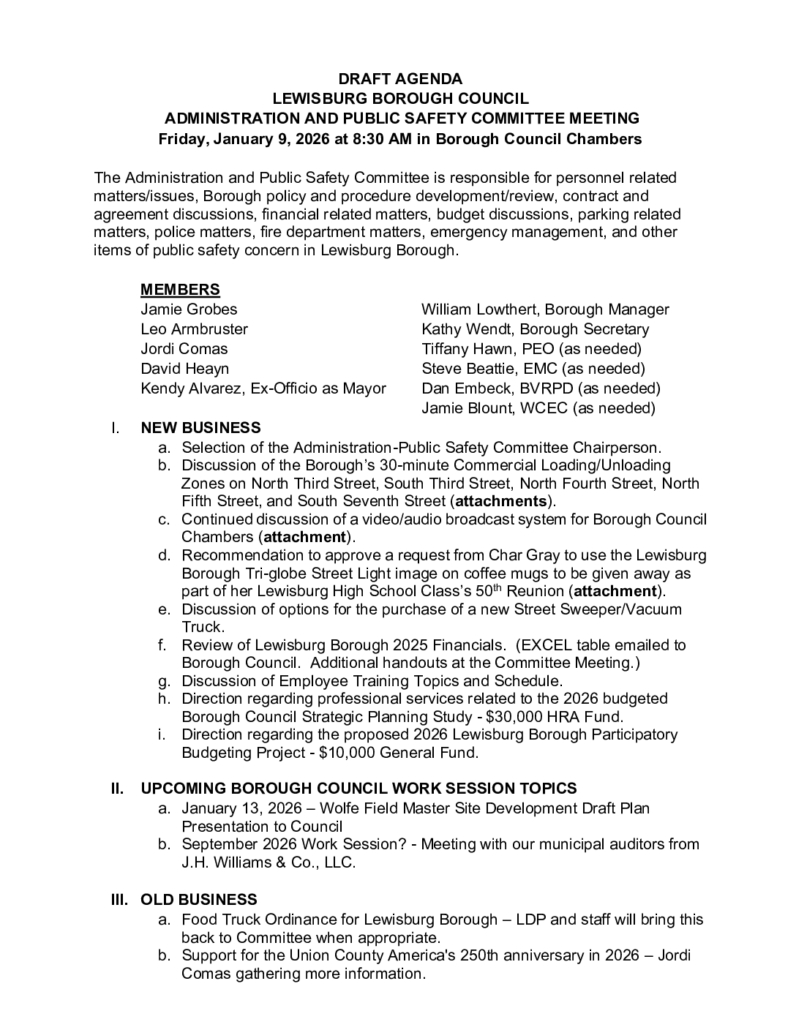 https://www.lewisburgborough.org/wp-content/uploads/LewisburgBoroughLogo-Darker_web.png00Kathy Wendthttps://www.lewisburgborough.org/wp-content/uploads/LewisburgBoroughLogo-Darker_web.pngKathy Wendt2026-01-07 07:55:002026-01-07 07:55:001 – January 2026 Administration and Public Safety Committee Draft Agenda