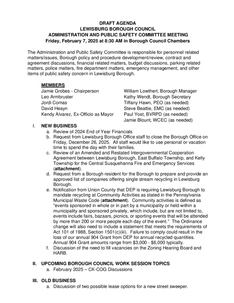 https://www.lewisburgborough.org/wp-content/uploads/LewisburgBoroughLogo-Darker_web.png00Kathy Wendthttps://www.lewisburgborough.org/wp-content/uploads/LewisburgBoroughLogo-Darker_web.pngKathy Wendt2025-02-03 14:04:582025-02-03 14:04:582 – February 2025 Administration and Public Safety Committee Draft Agenda