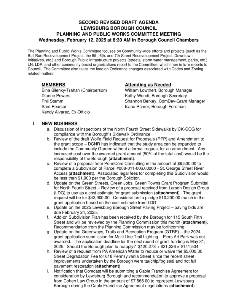 https://www.lewisburgborough.org/wp-content/uploads/LewisburgBoroughLogo-Darker_web.png00Kathy Wendthttps://www.lewisburgborough.org/wp-content/uploads/LewisburgBoroughLogo-Darker_web.pngKathy Wendt2025-02-11 12:54:052025-02-11 12:54:052 – February 2025 Planning-Public Works Committee Draft Agenda Second Revised