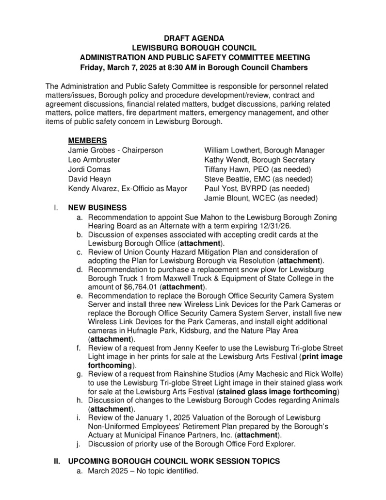 https://www.lewisburgborough.org/wp-content/uploads/LewisburgBoroughLogo-Darker_web.png00Kathy Wendthttps://www.lewisburgborough.org/wp-content/uploads/LewisburgBoroughLogo-Darker_web.pngKathy Wendt2025-03-04 07:11:542025-03-04 07:11:543 – March 2025 Administration and Public Safety Committee Draft Agenda
