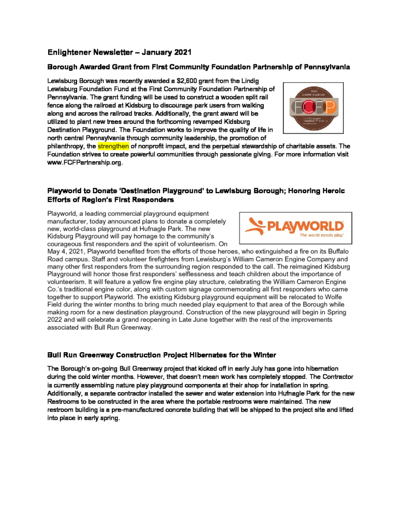 2022 January_Enlightener Newsletter_Grant Award_Hufnagle Park Update